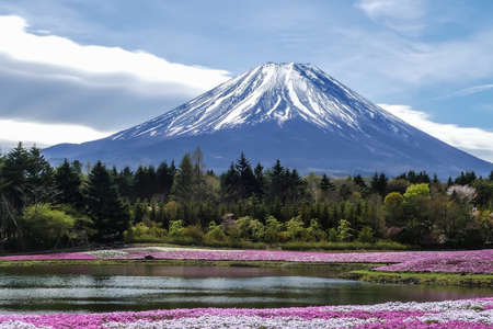 Fuji Mountain with the field of pink moss (moss phlox, moss pink, mountain phlox) in the park at Shibazakura festival