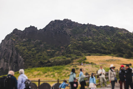 Jeju-do, Seongsan Ilchulbong landscape, volcanic tuff cone, Sunrise peak, Jeju Island, South Korea, Seongsan-ri, Seogwipo, Jeju Province landscape view in a sunny day, with sea, cliffs hiking trail