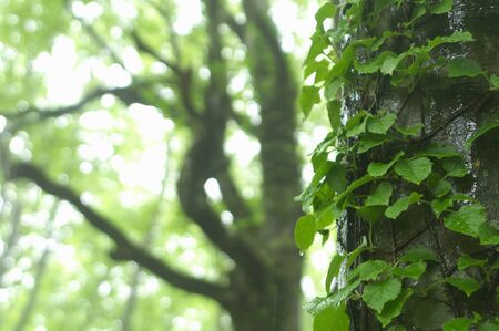 Textured tree bark stands out with vibrant moss, surrounded by a misty forest atmosphere, creating a serene setting.