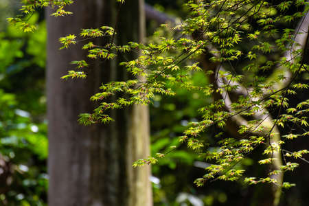 Branches of maple with tiny flower in soft focus on blurry background in Japan, Spring background and beautiful natural scenery.