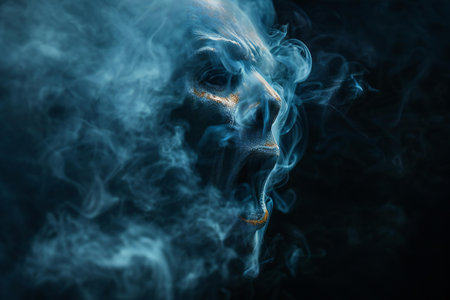 Blue color tinted photo with smoke fume on dark black background.