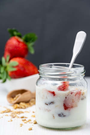 Close-up of jar of yogurt with strawberries and muesli with spoon, bowl with strawberries, selective focus, on white table, gray background, vertical