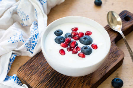 Yogurt with blueberries on white table