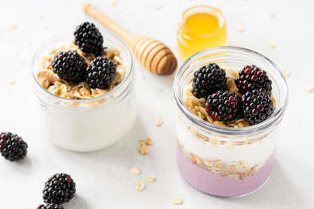 Greek yogurt with granola, blackberries and honey. Breakfast in a jar. Healthy eating, healthy lifestyle concept