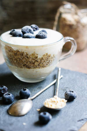 Yogurt, oatmeal, blueberries on a light background