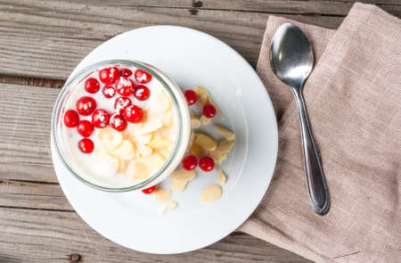 Food and drink, still life concept. Home made yogurt with frozen red currant berries on a wooden table. Selective focus