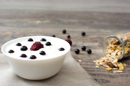 Yogurt and fresh berries in white bowl for breakfast