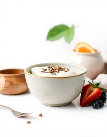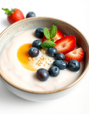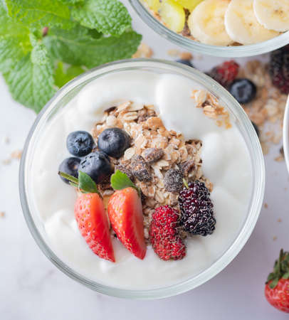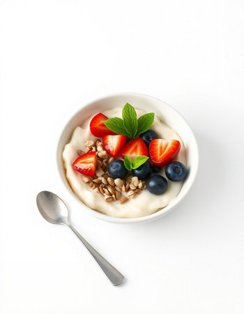 yogurt with granola and fresh berries on a white background