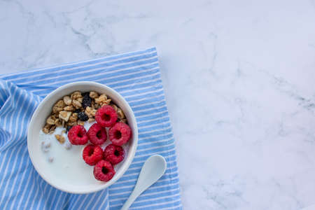Bowl of homemade granola cereal with greek yogurt and fresh raspberry berries on white marble table background. Top view, flat lay, copy space. Healthy eating concept.