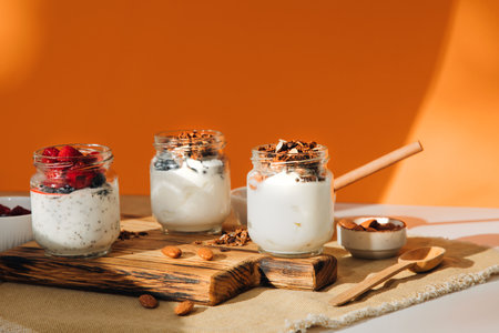 Yoghurts in glass jars with blueberries, raspberries and chia seeds and granola on a wooden board on a orange background. The concept of healthy eating. Front view