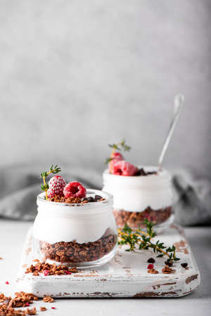 homemade chocolate granola with yoghurt and fresh berries, close-up