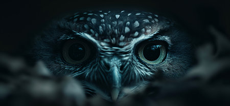 A stunning owl faces the viewer, its golden eyes glimmering in low light. The intricate details of its feathers showcase natures beauty, creating an enchanting moment in the dark.