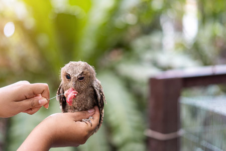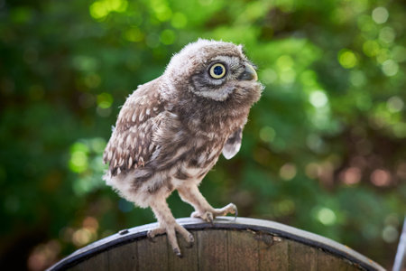 Young Little owl, Athene noctua,sitting on a stick against a blurred natural background. With copy space.