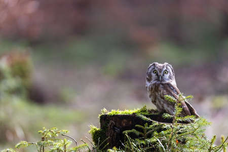 Eurasian pygmy owl (Glaucidium passerinum) sitting on a tree stump in the forest in fall.