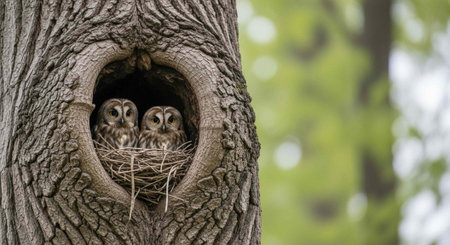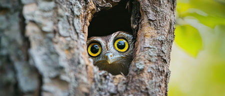 A curious owl peeks out from a tree hollow showcasing its large eyes. Sunlight filters through the leaves in a natural setting.