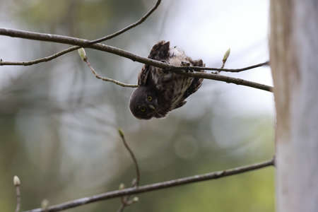 Cute boreal owl is sitting on the tree branch. Horizontally.
