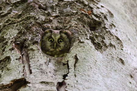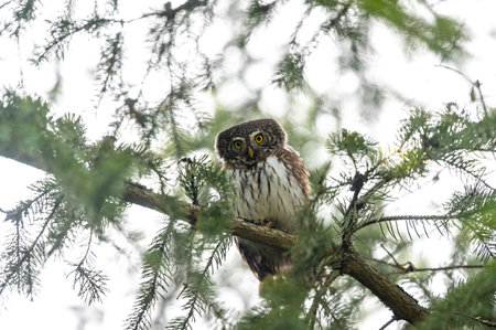 A shy Boreal owl rests quietly among spruce branches. This elusive nocturnal hunter inhabits mountain forests and is rarely seen during the day.