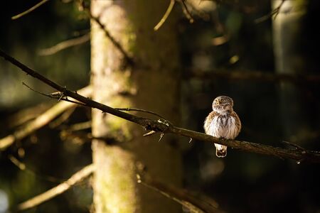 Pygmy Owl, sitting on a tree branch with forest background. Beautiful bird in evening sunset. Wildlife scene from wild nature. Eurasian tinny bird in the habitat.