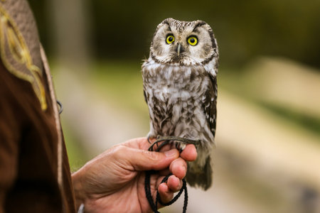 close up photo of an owl bird with beautiful yellow eyes and curved beak