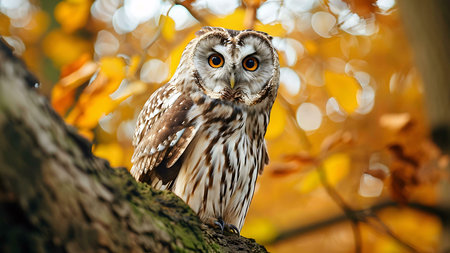 A stunning Ural owl perched on a tree branch, surrounded by vibrant autumn foliage.