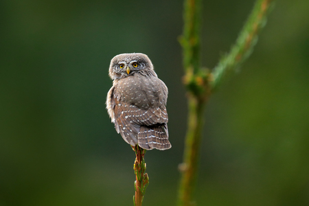 Small bird Eurasian Pygmy Owl, sitting on spruce tree trunk with clear dark green forest background, in the nature habitat, Czech. Owl in the forest. Small owl in nature habitat. Wildlife in Europe.