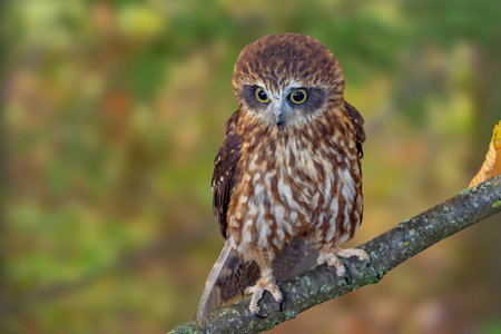 Eurasian scops owl (Otus scops) - Small scops owl on a branch in autumnal forest, its natural habitat