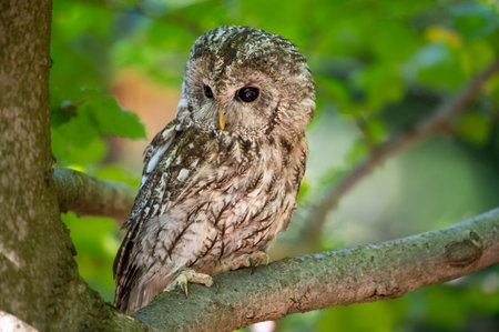 A young tawny owl (Strix aluco) hidden in green leaves of a tree.