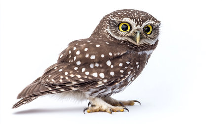 A closeup shot of a little owl standing on the ground and looking at the camera with a surprised face