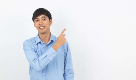 Young asian business man with blue shirt pointing to the side with a hand to present a product or an idea isolated on white background.