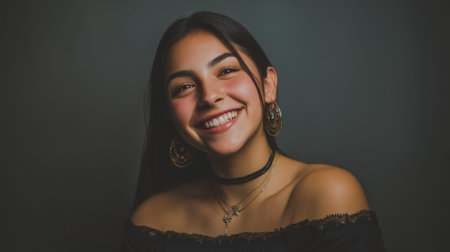 A young woman stands confidently with a bright smile, wearing a black sweater and earrings. She poses against a gray wall, creating a striking contrast.