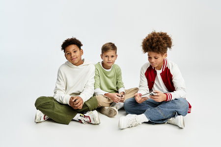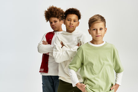 Three boys stand confidently in trendy outfits, showcasing their unique styles.