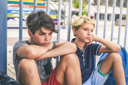 Sad young students waiting out of school the first lessons after summer vacation. Unhappy boys with backpack meet out of institute after holidays. Youth educational togetherness friendship concept.