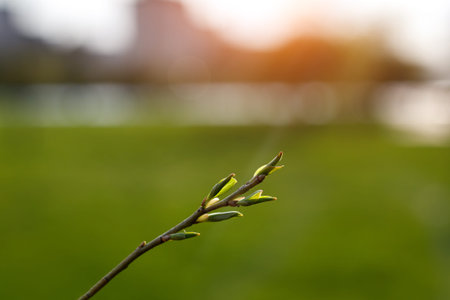 Twigs with green buds young first leaves on tree on sunny spring day on blurred background