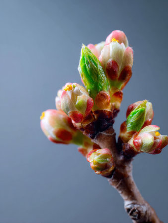 Fresh buds emerge on a branch, displaying bright green and pink hues in a serene indoor environment, signaling the arrival of spring.