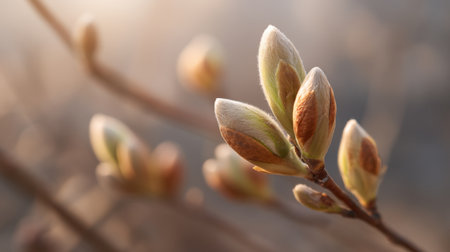 This close-up image showcases fresh tree buds about to blossom, set against a soft natural background. Ideal for nature and gardening themes.