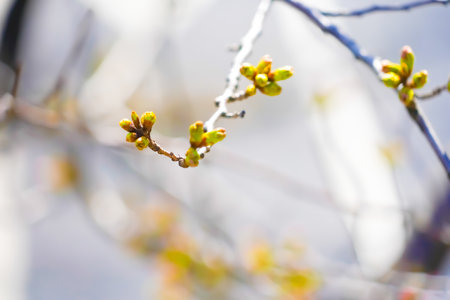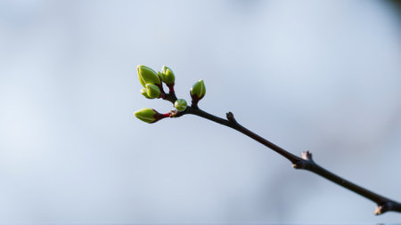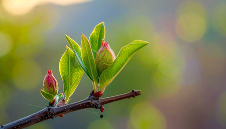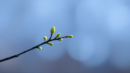 Spring buds on a branch, delicate green shoots emerging, set against a soft bokeh background of blues and warm sunlight, symbolizing renewal and growth in nature
