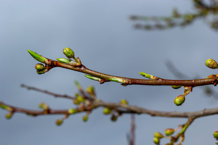 Macro of a branch of a cherry tree, with flowers and buds