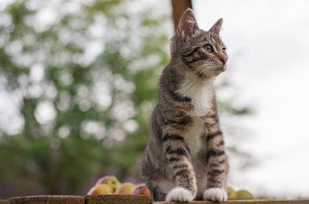 single young cat, wait and sit on a table in the outdoor