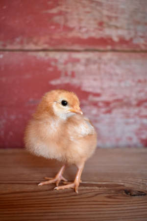 A chick on wood with a red barn board background