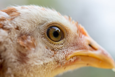 Detail of biblue breed chicken head. Munilla, La Rioja.