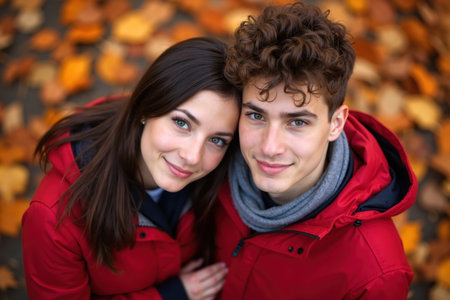 Young couple in red jackets with heads together, smiling at camera, surrounded by autumn leaves.