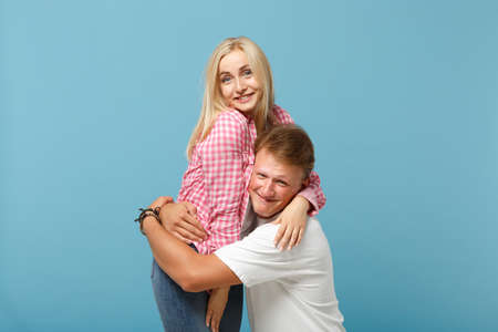 Young smiling couple two friend guy girl in white pink empty blank design t-shirts posing isolated on pastel blue background studio portrait. People lifestyle concept. Mock up copy space. Hugging.