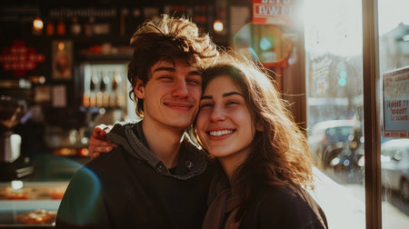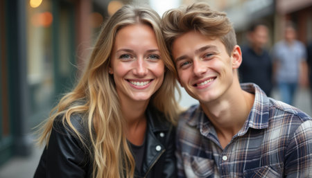 A charming young couple, a blonde woman and a brown-haired man, radiate happiness as they pose closely together in a lively street. Their genuine smiles and relaxed attire create an inviting atmosphere, perfect for capturing the essence of youthful love and friendship.