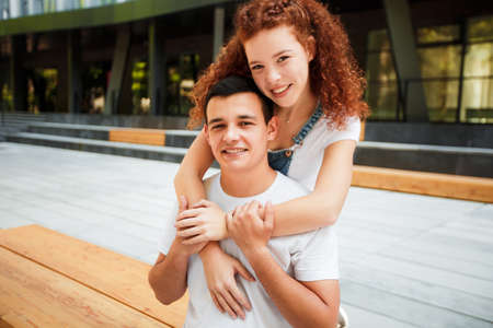 Portrait of a happy young couple in love outdoors in the city