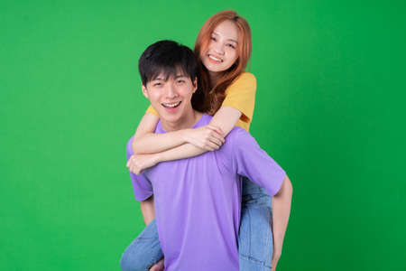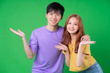 Young Asian couple posing on green background