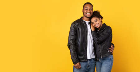 Loving African Couple Hugging Posing Wearing Black Leather Jackets Standing Over Yellow Background, Smiling To Camera. Studio Shot. Romantic Relationship Concept. Panorama With Free Space