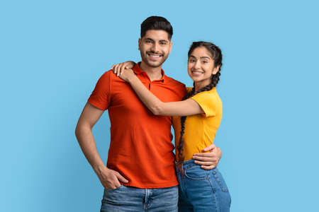 Portrait of positive young arabic couple hugging and posing at camera