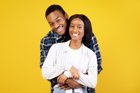 Cheerful young african american male and female in casual, hugging and looking at camera