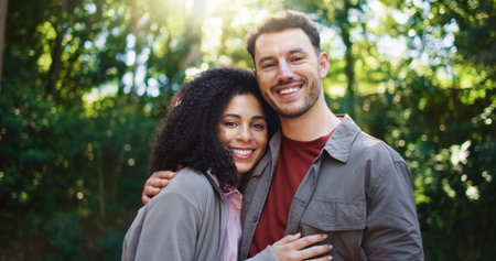 Happy couple, hug and portrait in forest with hiking, excited and interracial relationship on vacation. Woman, man and smile with embrace outdoor, care and love with trekking adventure on travel