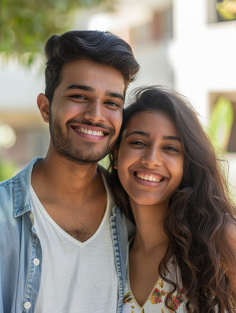A young Indian couple beams with joy under natural daylight, their modern attire blending traditional designs with a contemporary twist
